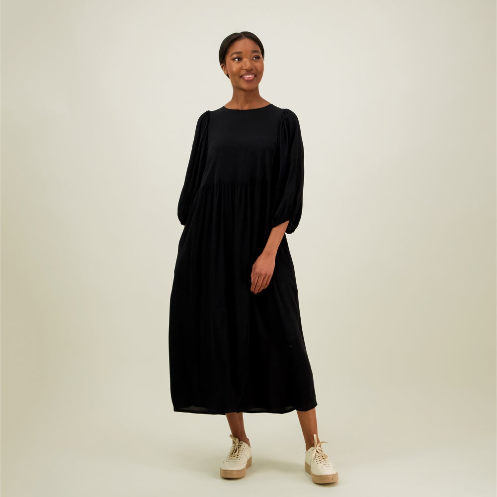 Volume Sleeve Midi dress on tyylikäs ja monikäyttöinen musta viskoosimekko, joka tuo askeleeseesi itsevarmuutta ja keveyttä. Sävy Licorice on klassinen musta – ajaton valinta, joka toimii niin arjessa kuin juhlavammissakin tilanteissa.