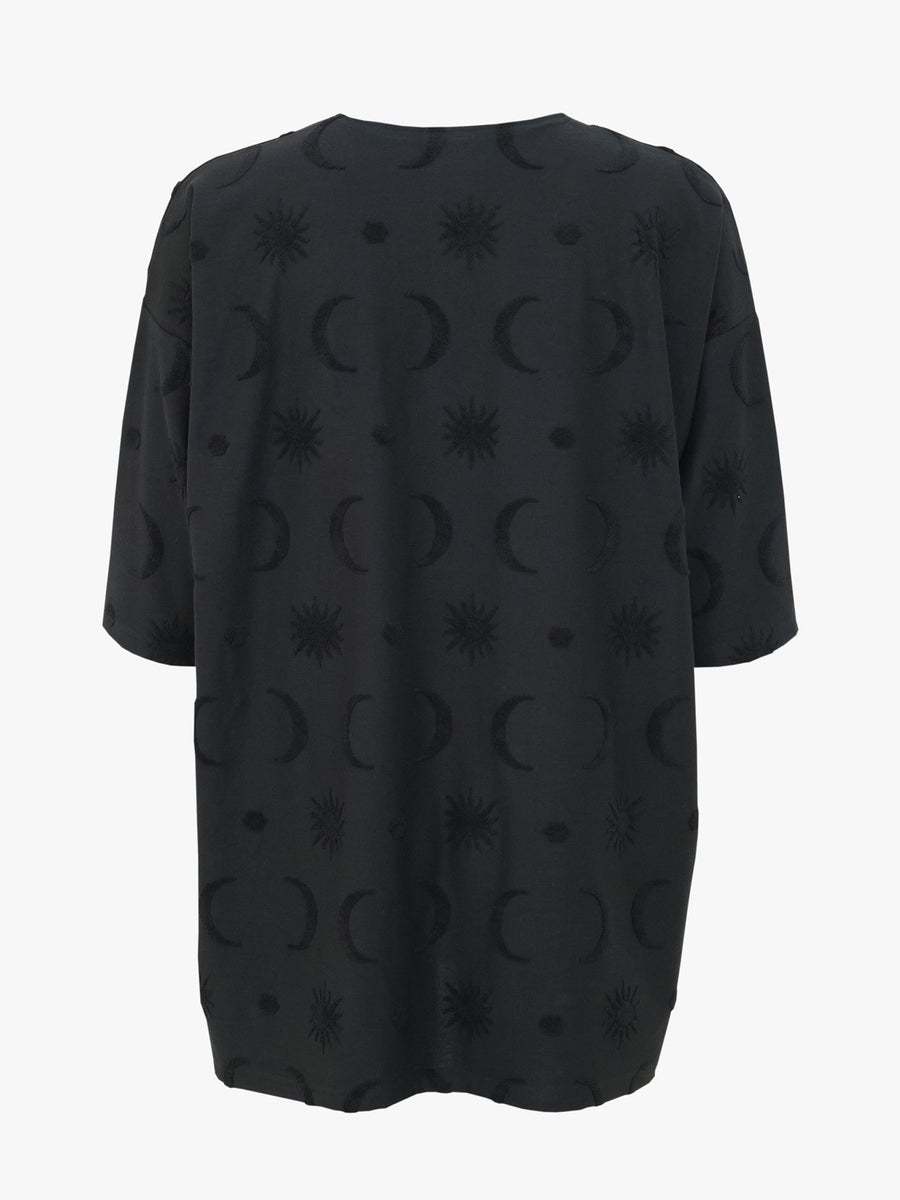 Mukavan rento oversize t-paita on luottovaate, joka sopii niin toimistolle kuin vapaa-aikaan. Paidan jujuna on hauska Divine struktuurikuosi, jossa froteemaiset, taivaankappale-aiheiset kuviot kohoavat neuloksen pinnasta, tuoden mielenkiintoisen yksityiskohdan yksiväriseen paitaan. Paidassa on pyöreä pääntie, 1/2 hihat, ja laskettu olkasauma. Materiaali on hieman trikoota vahvempaa, joustavaa jakardineulosta.