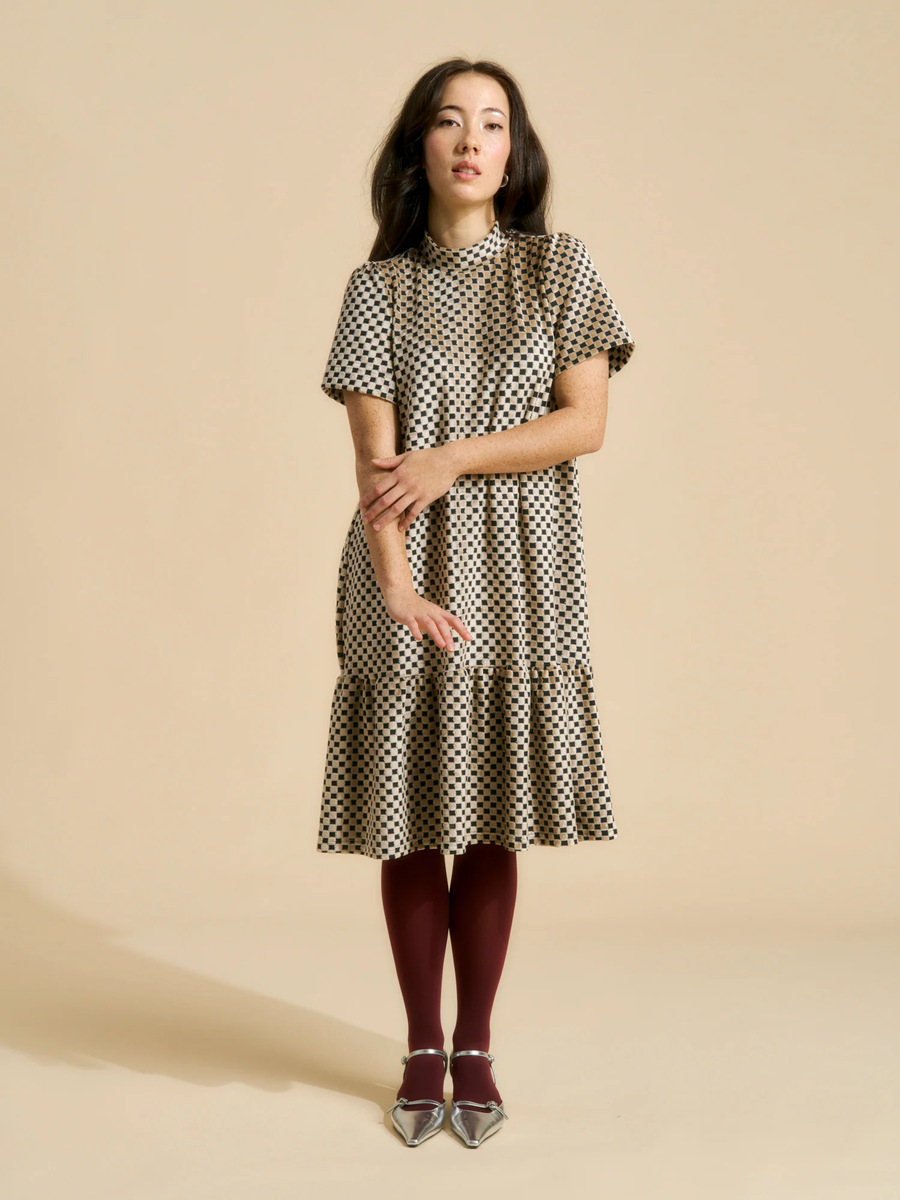 Hohtava, A-linjainen Montana mekko on tilaisuuksien valopilkku! Mekko on valmistettu juhlavasta Chess -jakardineuloksesta, joka laskeutuu kauniisti. Kankaassa on himmeästi hohtavia velour-ruutuja mustalla pohjalla. Montana-mekko on näyttävä ja samalla mukava valinta esimerkiksi illallistreffeille tai juhlaan, sekä aina kun kaipaat hieman lisähohdetta päivääsi! Mekossa on lyhyet hihat, matala poolokaulus ja runsas frillahelma. Niskassa nappikiinnitys kahdella mustalla muovinapilla.