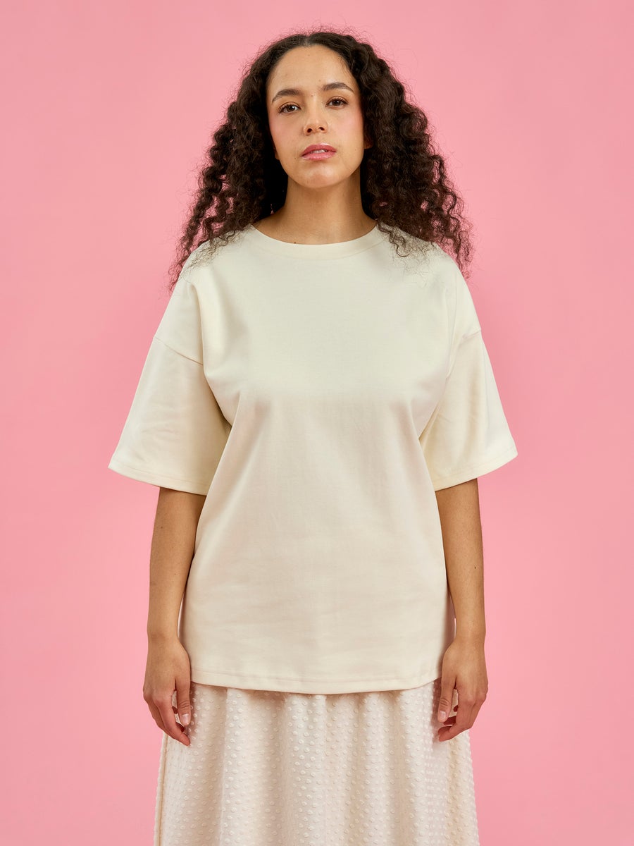 Queen unisex t-paita on monikäyttöinen ja laadukas peruspaita arkeen. Helppo yhdistää niin farkkujen, hameiden kuin suorienkin housujen kanssa. T-paidan materiaali on trikoota paksumpaa Ponto Roma -neulosta, jonka ansiosta paita on ryhdikäs, eikä materiaalista kuulla niin helposti läpi. Materiaali ei sisällä elastaania, mutta neulos joustaa silti jonkin verran. Laatikkomainen, väljä malli, jossa pyöreä pääntie ja lyhyet hihat.